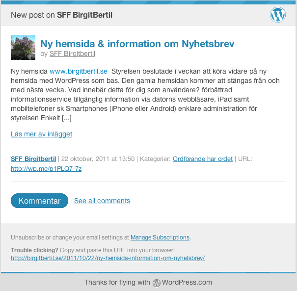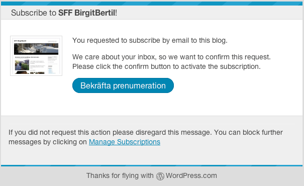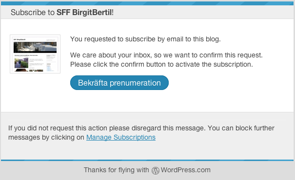 Anmäl dig till Nyhetsuppdatering via E-post. Er gamla anmälan gäller ej för nya hemsidan – vi ber er att förnya er prenumeration, ni finner anmälan till höger på startsidan. Ni får bekräfta er prenumeration på SFF BirgitBertils blogg via e-post. Sedan får ni enkelt en uppdatering via er E-post: